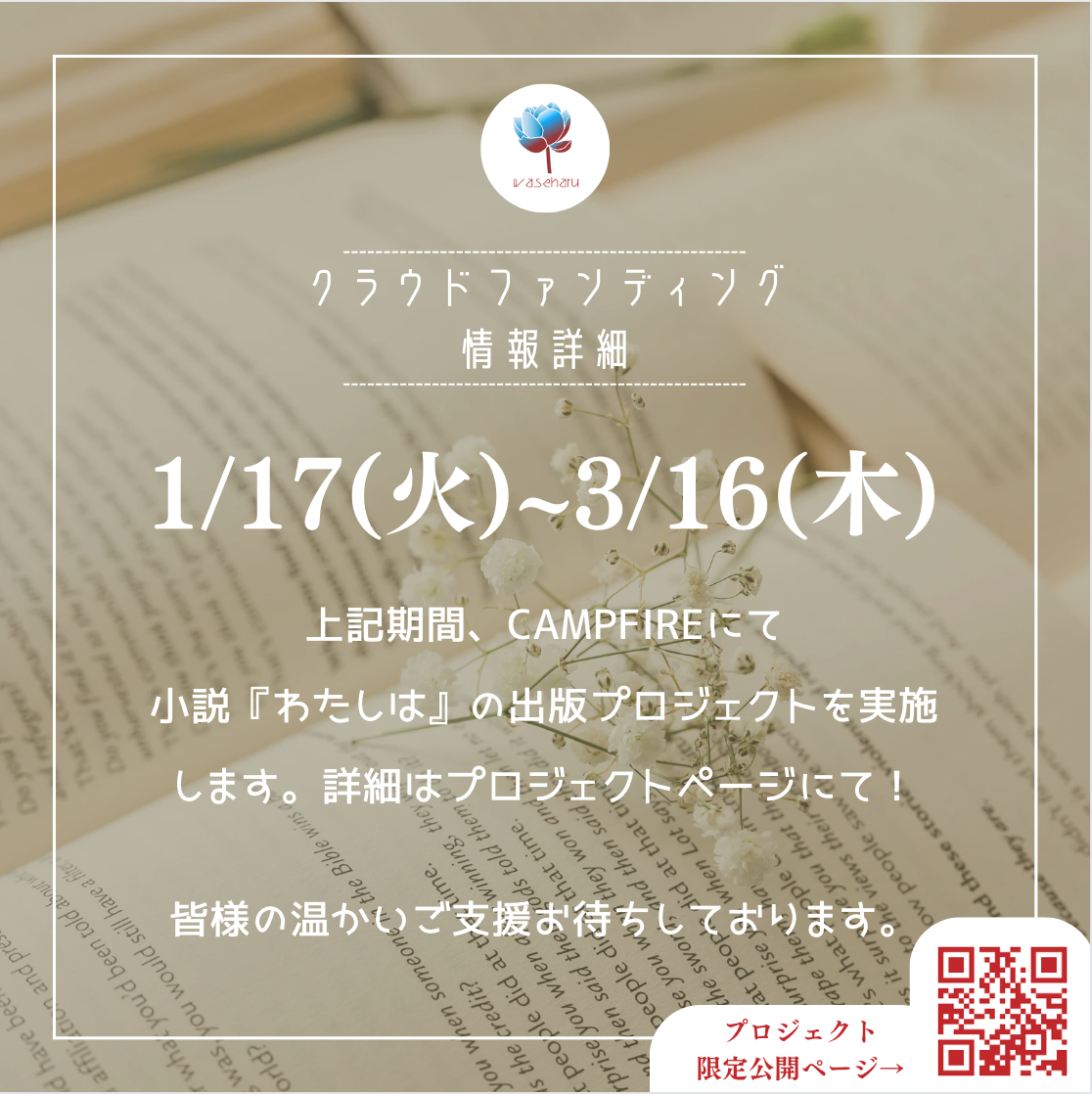 今回の作品はJCulP(国際日本文化論プログラム)で出会い、立ち上げた和花青春文庫が制作する一番最初の作品となります。国際日本学の根幹である『日本人とは』という問いを応え、それぞれの日本人の姿を描いた学生作家3名の合作小説の出版に向けてクラウドファンディング CAMPFIREのプロジェクトが始動します。